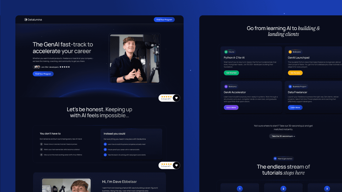 The Academy Datalumina website successfully launched as a highly engaging and effective learning platform. The strategic use of differentiated branding within a unified style created a professional yet dynamic environment. The focus on high-converting landing pages, combined with interactive elements, has likely contributed to increased user engagement and enrollment in their programs.