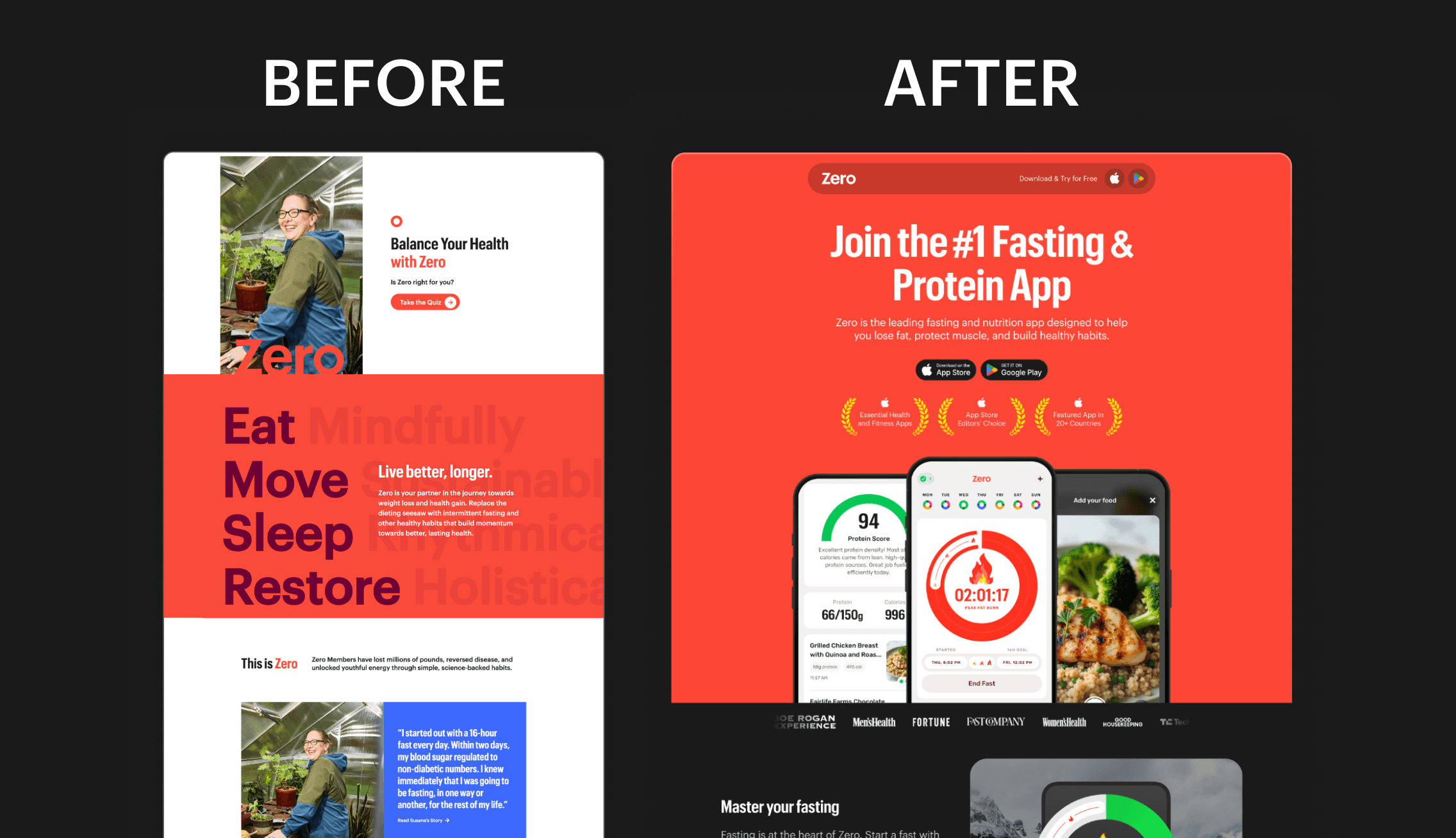The Zero team came to us with a tight deadline — they wanted a new website ready for the new year. Their existing site was outdated, misaligned with the current app branding, and filled with scattered call-to-actions like "Take Quiz" that weren't built to convert. With 700K+ annual visitors, the opportunity cost of a low-converting site was significant.